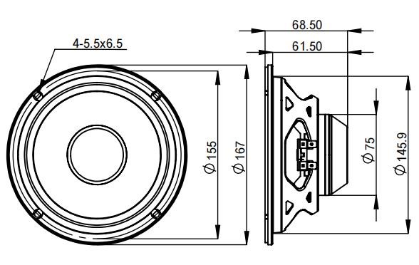 61NPM was developed for all applications where compact and lightweight t mid-woofer is required. The driver delivers very good performance in mid-frequencies, with a good extension into the low frequencies. Neodymium based magnetic circuit was optimized to deliver the highest level of performance. Lightweight paper cone with glass fibers is attached to “M” roll fabric surround. It provides great combination that delivers very good performance across wide range of frequencies. Our newly designed basket was structurally reinforced and supports the magnetic structure with ease. Furthermore, the driver sports front and rear gaskets, thus you can mount it into the baffle as front or rear mount.